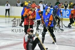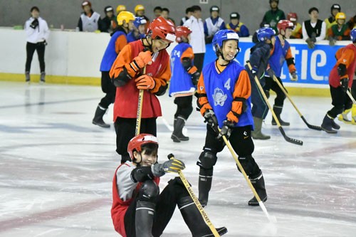 [写真/長ぐつアイスホッケーにチャレンジするサンシャインズの選手ら。歩いて、転んで、笑って楽しんだ ]