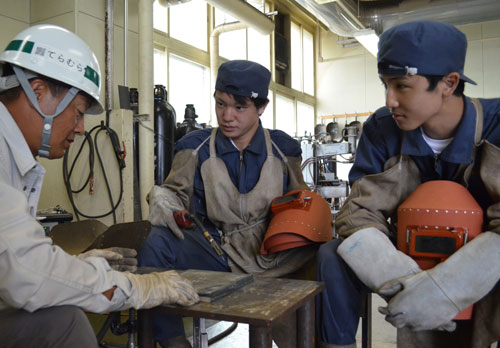 [写真/寺村課長代理から溶接の指導を受ける岩崎さん(中)と塩濱さん ]