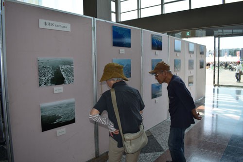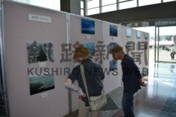[写真/釧路港120年の写真パネルに熱心に見入る市民 ]