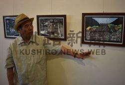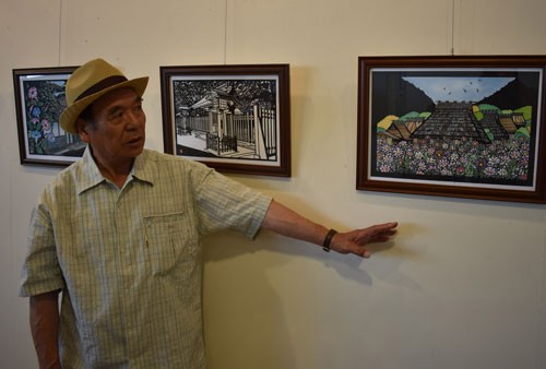 [写真/切り絵の制作過程を説明する川村さん(芦野館ギャラリー) ]