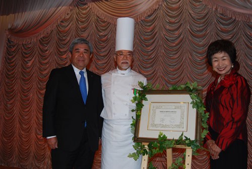 [写真/高橋千秋総料理長(中央)と棚野町長(左)、星澤幸子氏 ]