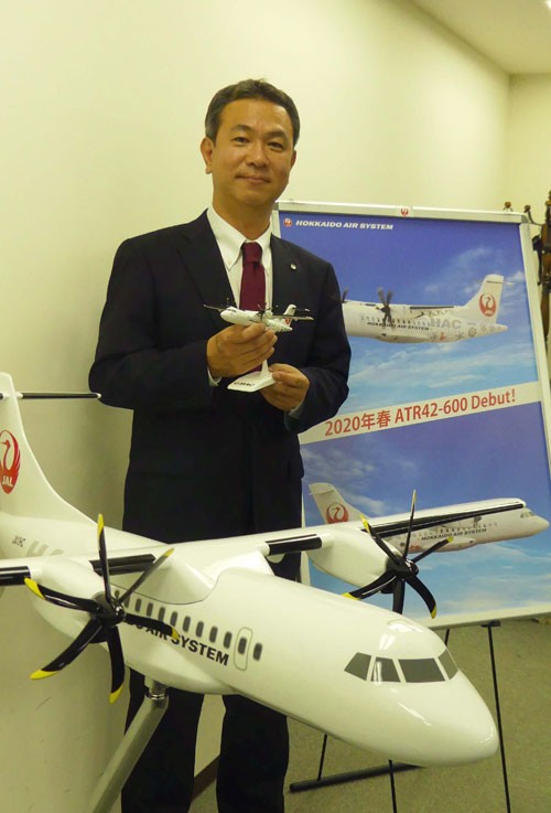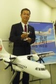 [写真/来年3月29日から就航させる新型機をPRする大堀社長 ]