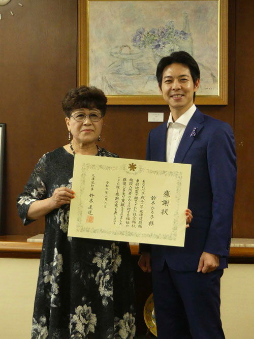 [写真/鈴木知事から感謝状を贈られた鈴木さん(左) ]