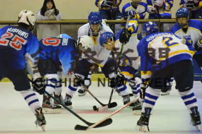 [写真/氷上で激突する東大(右)と釧路景雲中 ]