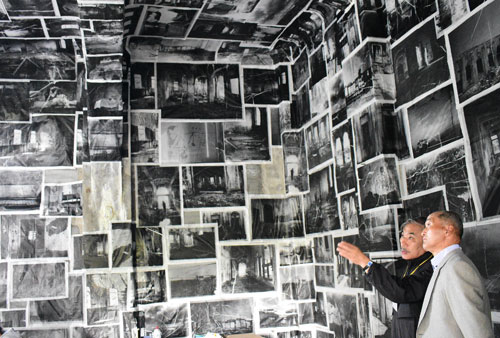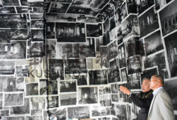 [写真/局舎を飾る写真の記憶を説明する池田さん(右から2人目) ]