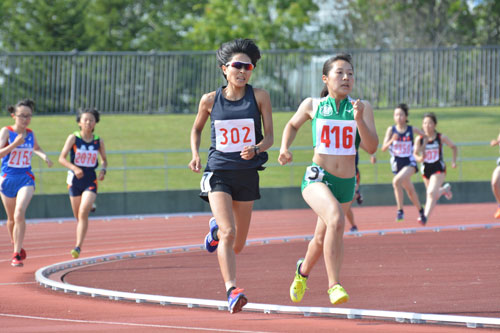 [写真/共通女子800㍍の川内侑子選手(左)。粘りを見せ、最後の最後で逆転 ]