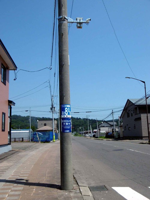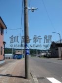 [写真/民家が途切れた通学路の電柱に設置された防犯カメラ。電柱下には「防犯カメラ作動中」の表示板も ]