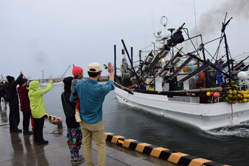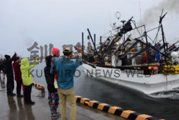 [写真/見送りを受けて漁場を目指すサンマ棒受け網漁の小型船(10日午前5時55分、根室・花咲港) ]