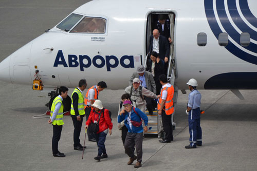 [写真/到着したチャーター機から降りる墓参団(11日正午ごろ、中標津空港) ]