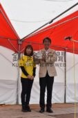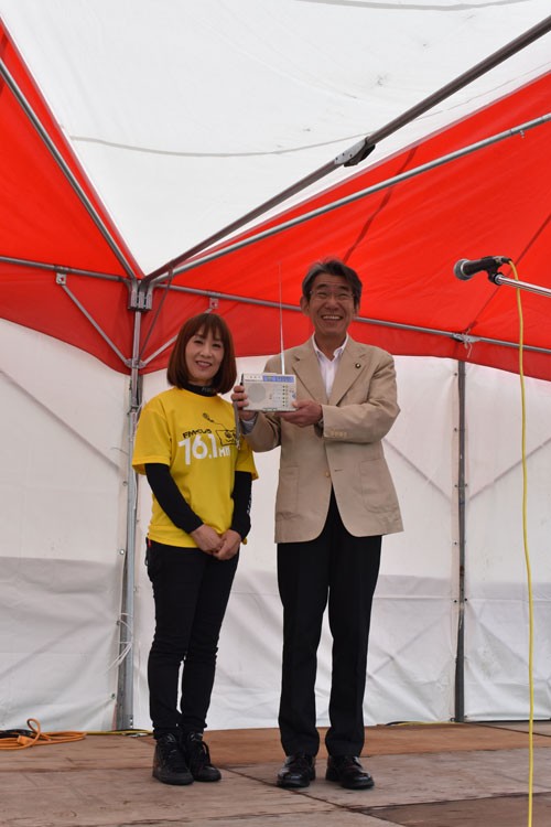 [写真/阿部社長(左)から緊急告知ラジオを受け取った蝦名市長 ]
