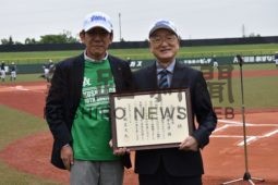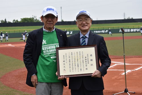 [写真/蝦名市長(左)から寄付への感謝状を受け取った大島学長 ]