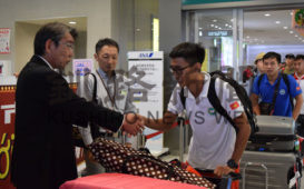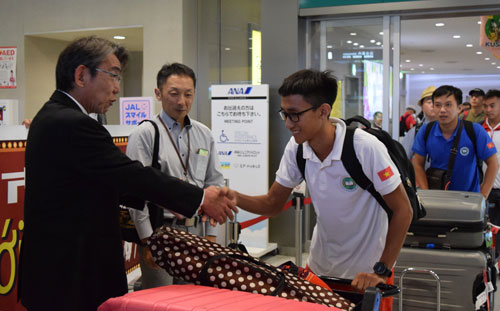 [写真/握手を交わす蝦名市長(左)とベトナムの選手団 ]
