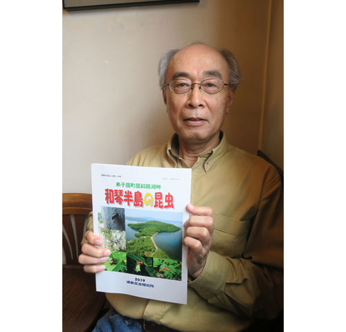 [写真/8年間の調査をまとめた「和琴半島の昆虫」を手にする中谷さん ]