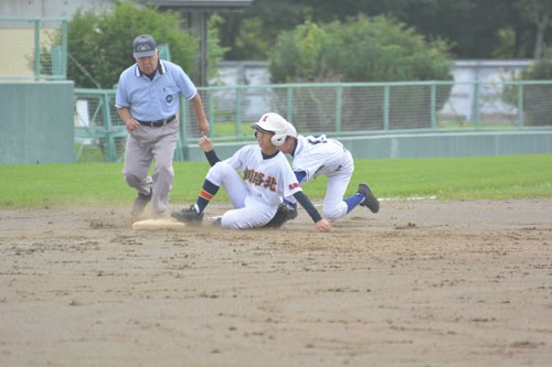 [写真/【1回戦、釧北・釧共栄・釧美原―標茶・鶴居】初回、2点適時打を放ち、積極的な走塁で三塁に到達した釧北・釧共栄・釧美原の本間 ]