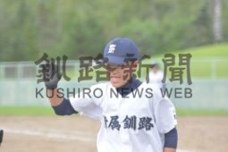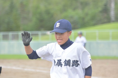 [写真/【準々決勝、附属―厚岸連合】5回、中越え適時二塁打を放ち、自らも生還し喜ぶ附属の宮下 ]
