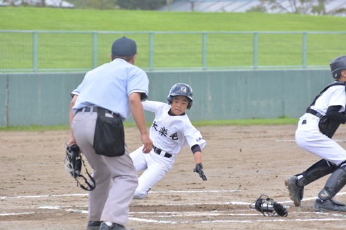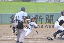 [写真/【準々決勝、釧鳥取西・釧大楽毛・釧阿寒―白糠・庶路学園・釧音別】初回、タッチアップで本塁へ。先制に成功した釧鳥取西・釧大楽毛・釧阿寒の佐山 ]