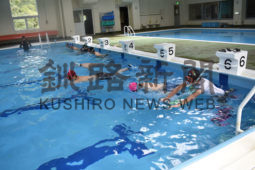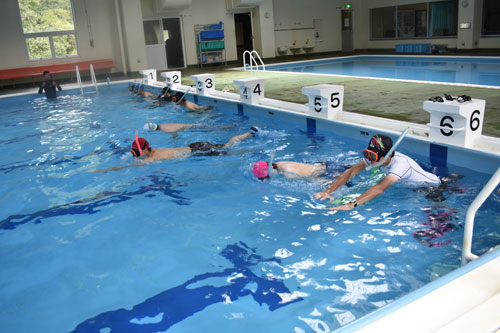 [写真/シュノーケルマスクとフィンを使用した実技に挑む生徒たち ]