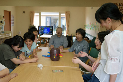 [写真/小学生や高校生とゲームを楽しむ入居者ら(14日) ]