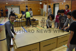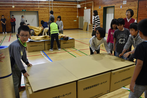 [写真/段ボールベッドを素早く組み立てる児童 ]