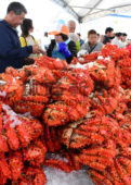 [写真/真っ赤な花咲ガニがうず高く積まれた根室かに祭り ]