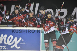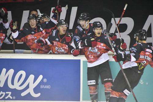 [写真/【ひがし北海道―栃木日光】第2ピリオドにプロ初ゴールを決め仲間たちと喜び合うDF蓑島(右から2人目) ]
