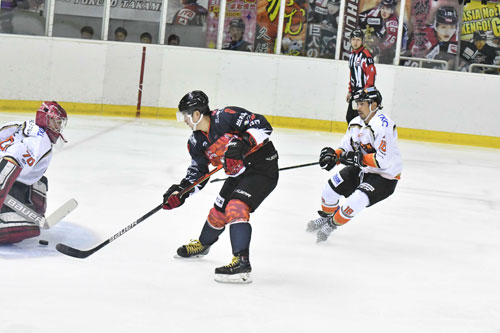[写真/【栃木日光―ひがし北海道】第2ピリオド7分、GKの動きを見て、股下を抜くシュートを決める入倉 ]