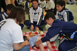 [写真/おしめの交換に四苦八苦の中学生 ]
