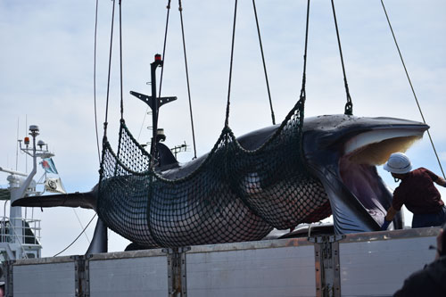 [写真/釧路港の北埠頭に水揚げされたミンククジラ(2日正午ごろ、水谷友路撮影) ]