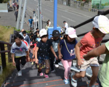 [写真/避難所の階段を駆け上がる児童生徒ら ]