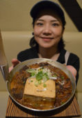 [写真/ふわふわもつ煮豆腐を手に、来店下さいと話す窪店主 ]