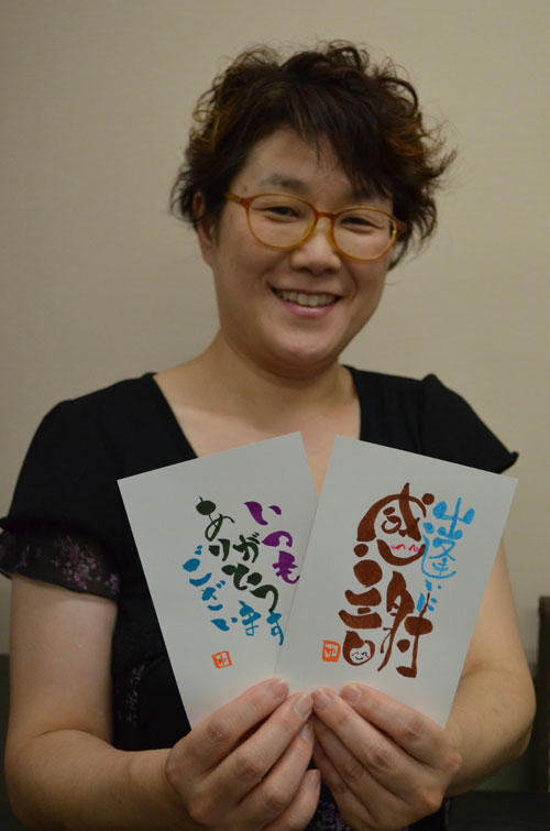 [写真/感謝の言葉を伝筆で贈ります―と加藤代表 ]