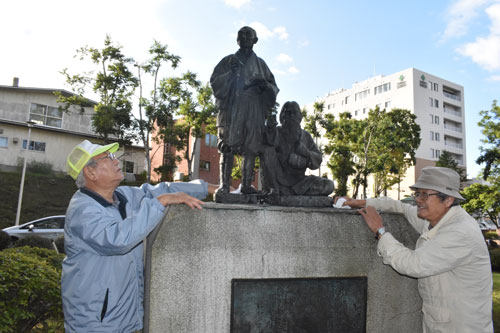 [写真/武四郎像を清掃した神戸さん(右)と高橋さん ]