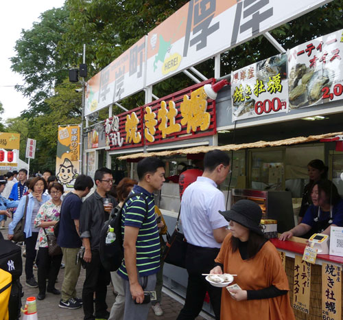 [写真/厚岸の焼きガキのブースには初日から行列ができた ]