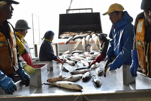 [写真/秋サケを選別する漁業者(5日午前6時50分ごろ、白糠漁港) ]