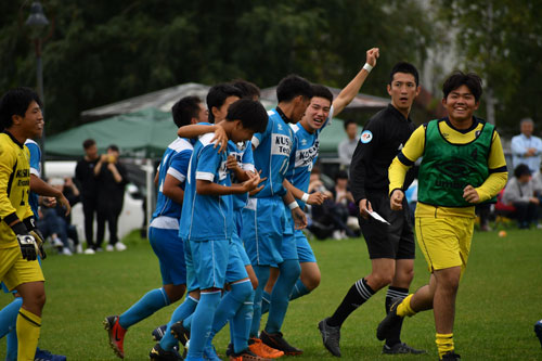 [写真/【決勝、釧工業―釧北陽】PK戦を制し、歓喜の雄たけびを上げる釧工業 ]