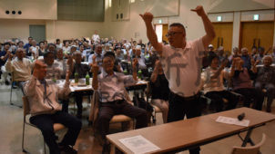 [写真/柿沼さんの指導で認知症予防に取り組む参加者 ]