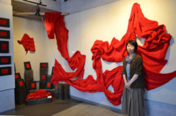 [写真/18㍍に及ぶ新作「born2」の前で南澤さん ]