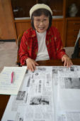 [写真/当時の新聞など資料を前に講師の伊戸川さん ]