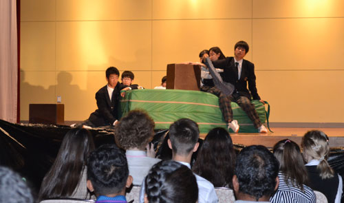 [写真/津波被災者の体験談を基にした寸劇を上演した生徒たち(霧多布高校) ]