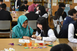 [写真/北陽高の生徒から折り紙を教わるツアー参加者(左) ]
