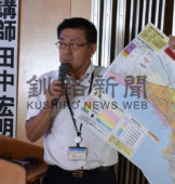 [写真/ハザードマップを見せながら西部地区の津波の浸水状況を説明する田中さん ]