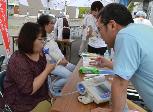 [写真/肺年齢を測定する来場者 ]