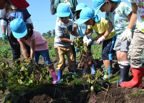 [写真/ジャガイモ掘りに熱中する園児 ]