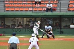 [写真/【Bブロック1回戦、武修館―霧多布】初回、直球を強振する武修館の西村。右越え適時三塁打に ]