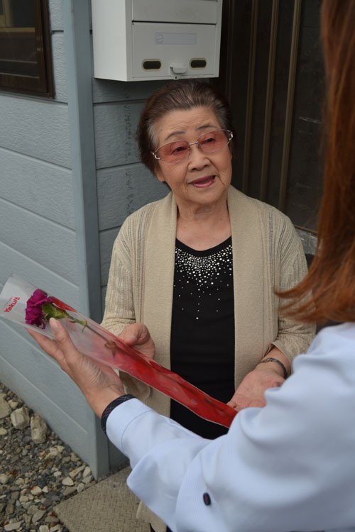 [写真/新沼さんからカーネーションを受け取る小塚さん ]