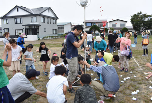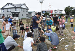 [写真/班別に分かれて行った紅白玉入れ ]