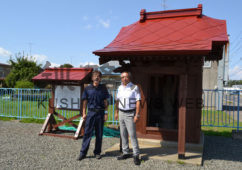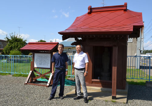 [写真/色を塗り直したほこらの前で佐々木会長(左)と田野代表取締役 ]