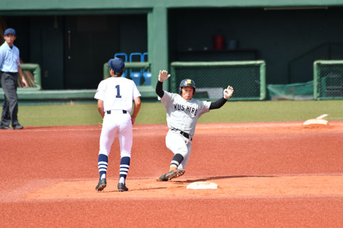 [写真/【Bブロック準決勝、釧工業―羅臼】2安打4打点で大暴れした釧工業の高橋。4回、右前打を放ち、積極的な走塁で二塁へ ]