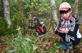 [写真/タンチョウが川で小魚などを食べやすくするため木の枝を払う子供たち ]