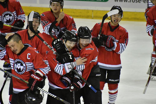 [写真/【釧路厚生社―スケートハウス札幌】延長4分、決勝ゴールを決めた釧路厚生社の田川(前列左)。この日、ハットトリックの活躍 ]